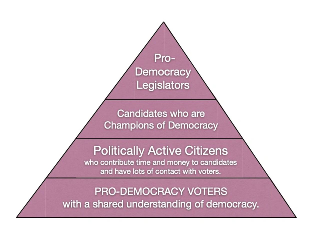 Getting pro-democracy reforms enacted will require a broad-based and inclusive grassroots movement. The vast majority of Americans believe in democracy, but the false friends and true enemies of democracy have succeeded in keeping us divided. True Friends and Champions of Democracy need to unite, across party lines and in spite of differences of opinion on divisive issues, in a broad-based and inclusive, pro-democracy grassroots movement.